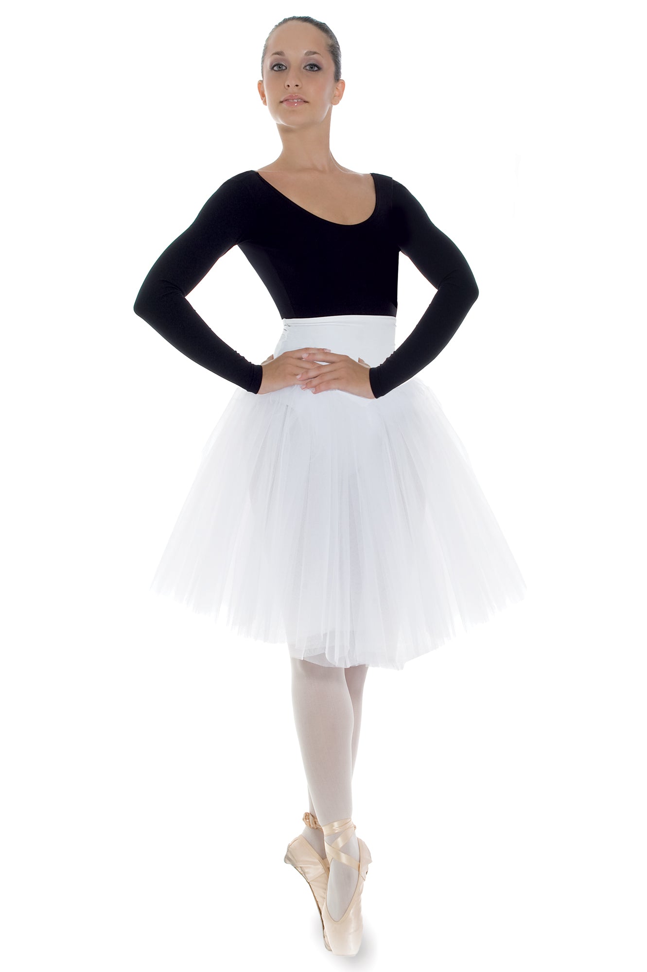 The high-waisted model adds a touch of style and sophistication, enhancing the silhouette and highlighting the movements of the ballerinas. It is perfect for dressing students during dance recitals and classical dance performances, ensuring a professional and harmonious look.